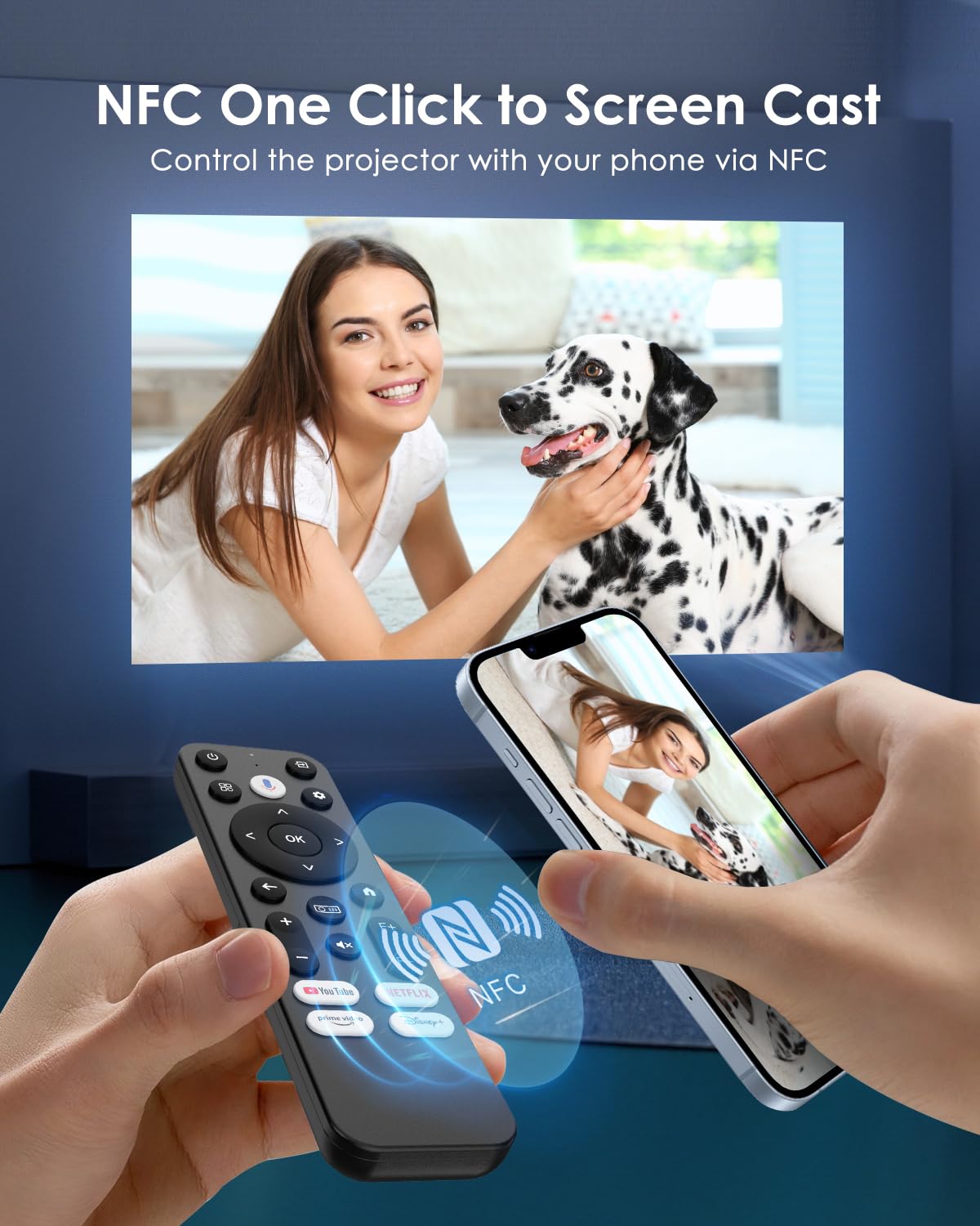 - [Licensed Apps & Voice Assistant] Enjoy the full benefits of the official Google Android TV projector with direct access to a wide range of streaming apps like Netflix,Prime video,YouTube etc, enjoy unlimited streaming service. Speak and reach what you want thanks to Google Voice Assistant.