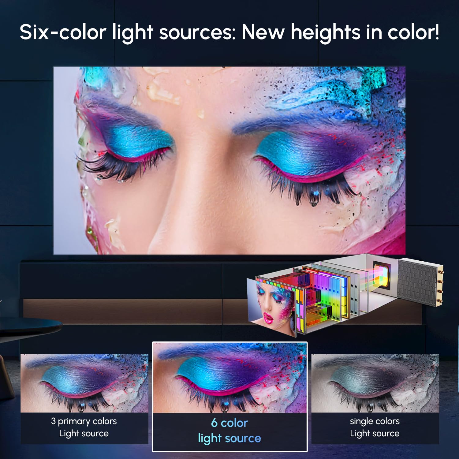 - [1700ANSI Daylight & 6-Color LED] Experience stunning visuals with 1700 ANSI lumens Daytime Brightness and 20000:1 High Contrast, delivering sharp, vibrant images even in some moderate-lit spaces. The 6-color LED system outperforms standard RGB, offering 30% wider color gamut for true-to-life hues, deeper contrasts, and natural skin tones. Perfect LCD projector for films, gaming, and professional content.