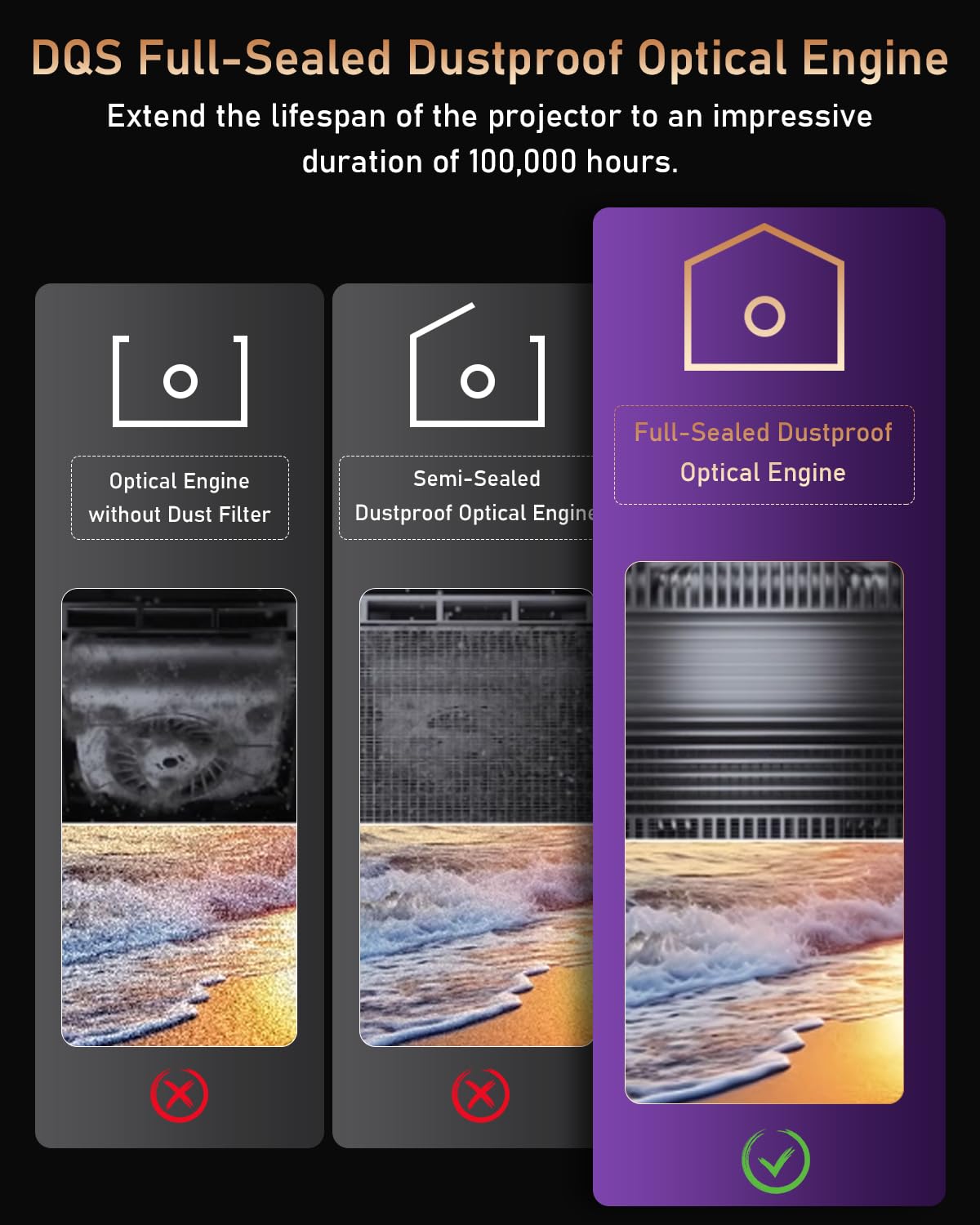 - [1600 ANSI Day/Night Clarity] Powered by TS-LED Chip, the A9T delivers 1600 ANSI lumens—40% brighter than LED projectors. Stream 4K sports in sunlight or host sunset-free backyard movie nights. Curtains stay open, drama stays on-screen
